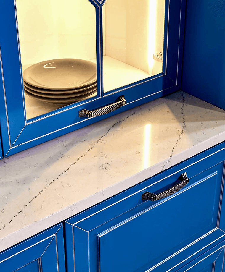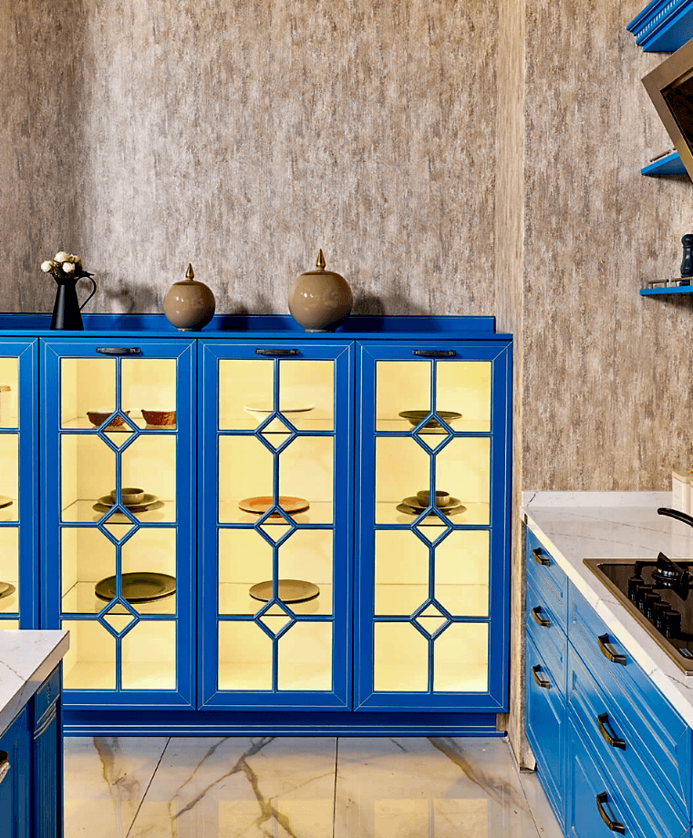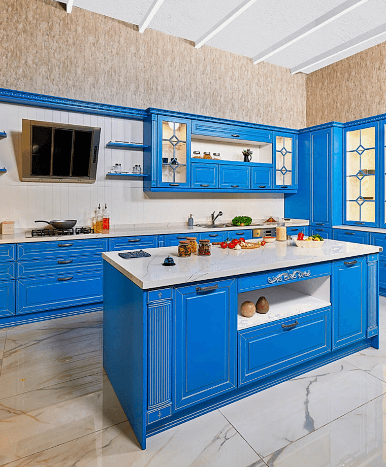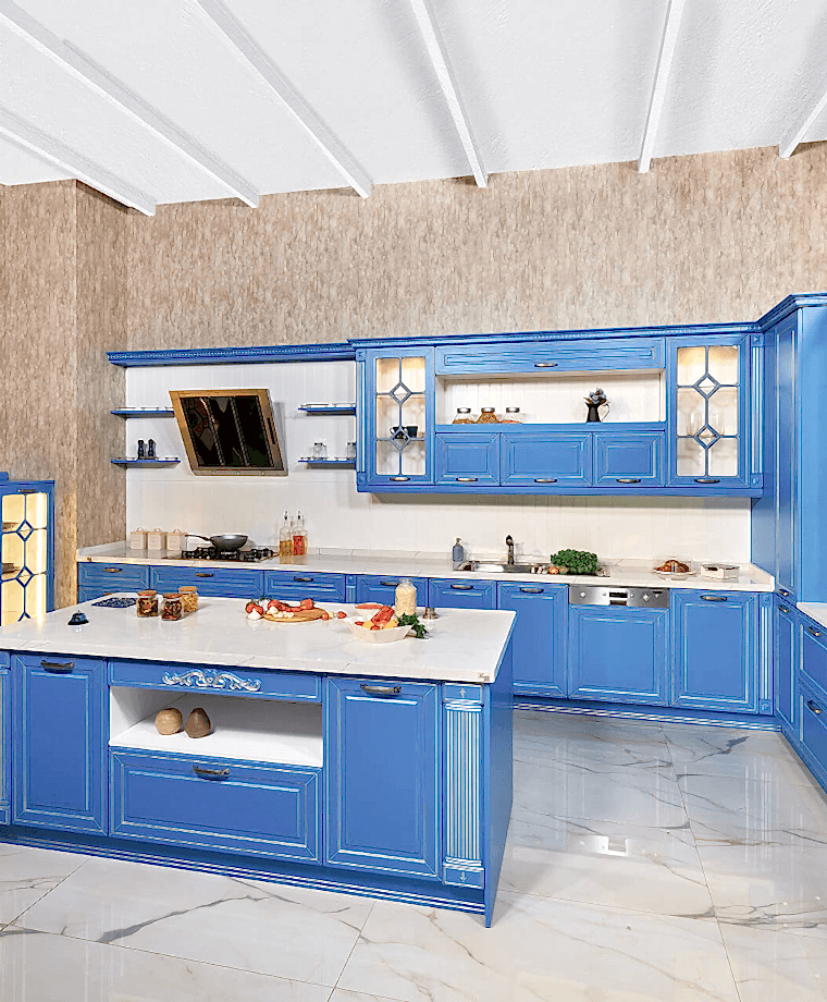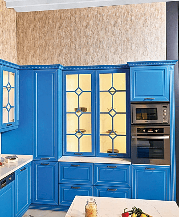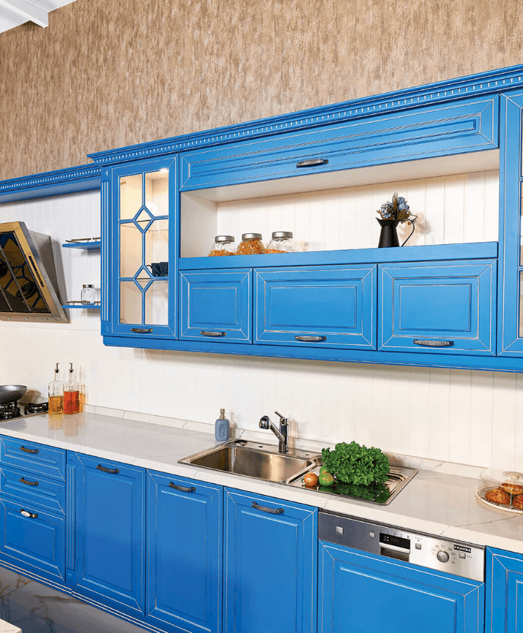 Klasik tarzı ve cam rafları ile Marine, mutfağına renk katmak isteyenler için ideal bir seçim.